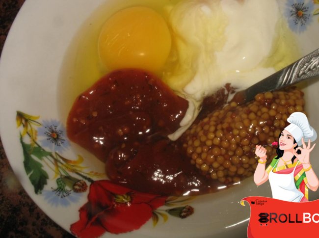 Готовим смесь из одного сырого яйца, а также кетчупа, горчицы с зернышками и сметаны - по одной ложке,