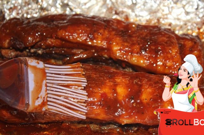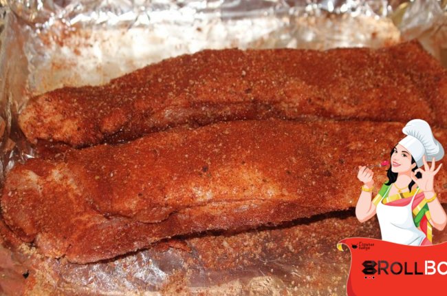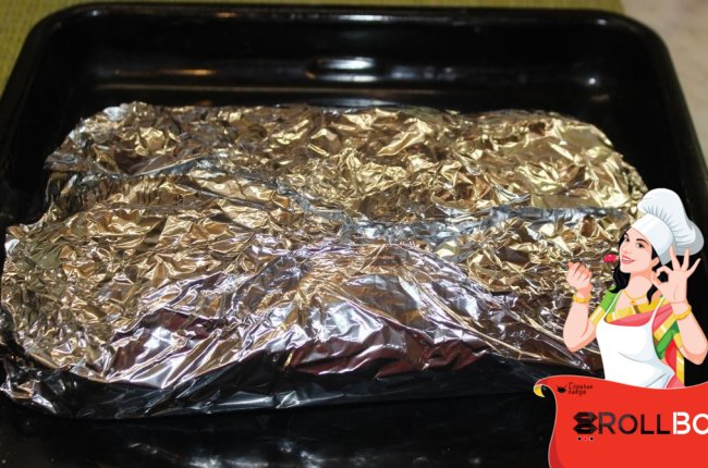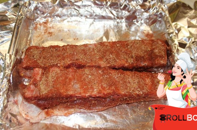Выкладываем рёбра на противень застеленный фольгой, чтобы фольга свисала по бокам.