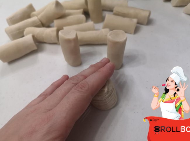 Разрезать на кусочки. Потом каждый кусочек надо поставить на доску вертикально, расплющиваем в кружочек....
