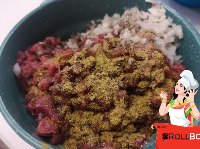 Репчатый лук тоже режем мелким кубиком. Все смешиваем, добавляя специи.