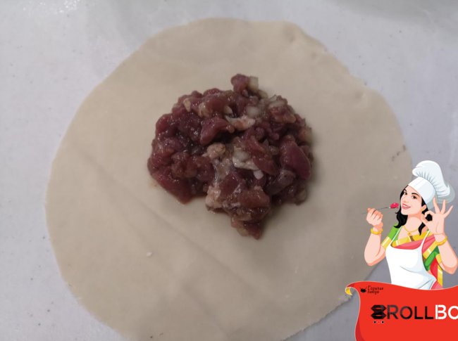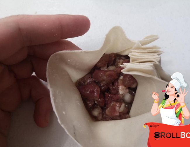 Пока вода закипает, формируем хинкали. В цент круга теста кладем мясо с бульоном.