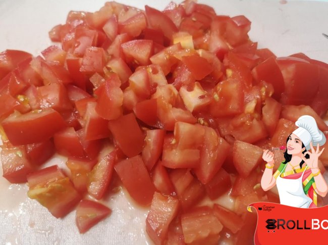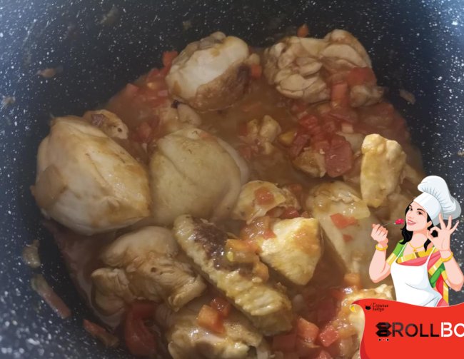 Томаты режем крупным кубиком, добавляем к курице и перемешиваем. Обжариваем.