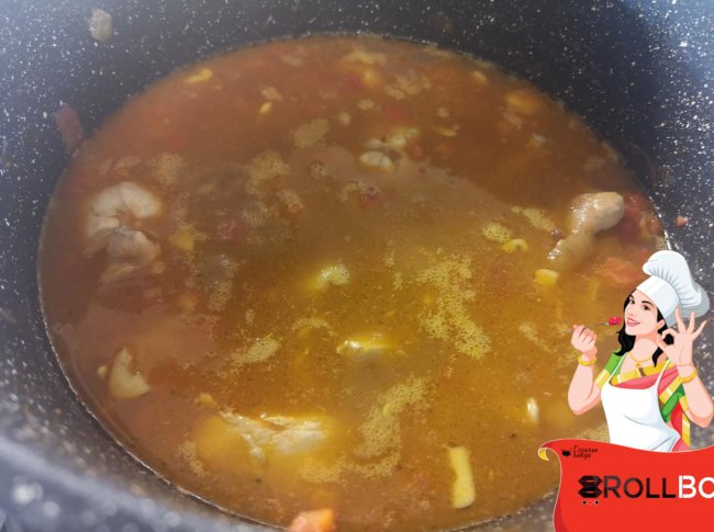 Вливаем в кастрюлю бульон. Солим. Тушим на большом огне с открытой крышкой до тех пор, пока не выпарится треть жидкости. Добавляем молотый кориандр, чили, имеретинский шафран. Перемешиваем.