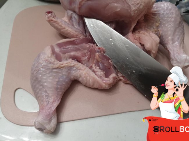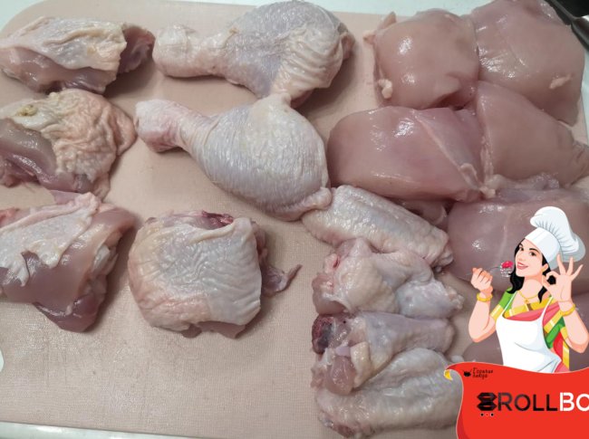 Продолжаем... крылышки делим пополам, филе режем на три части. У ножек надо отрезать нижнюю часть (на фото это не видно, я потом отрезала)... потом отделить голень, а бедро на две части.