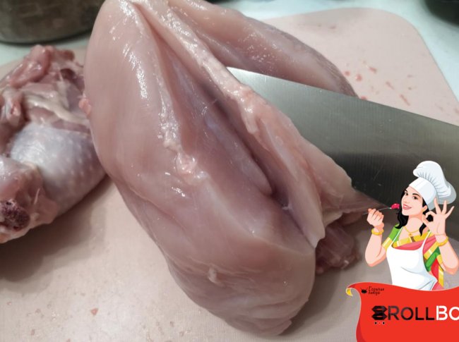 Отделим ножки, крылышки. Уберем кожу с грудки, сделаем надрезы вдоль грудины и отделим филе грудки.