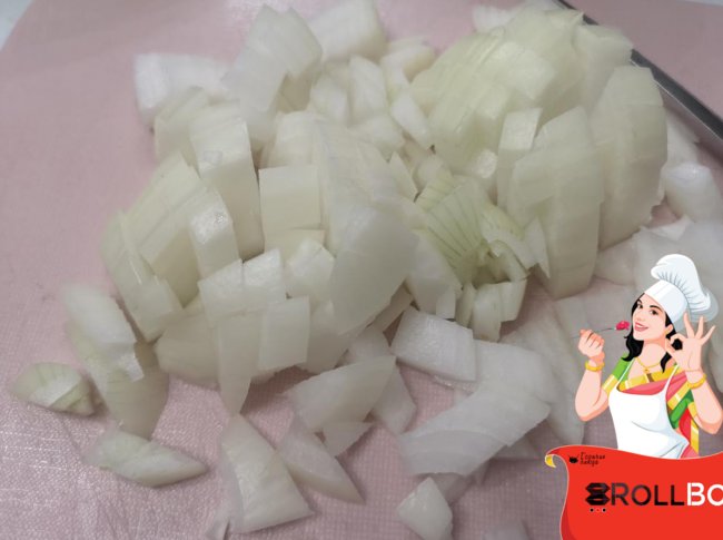 Перекладываем его в кастрюлю, наливаем туда растительное масло и только тогда включаем сильный огонь. Обжариваем лук.
