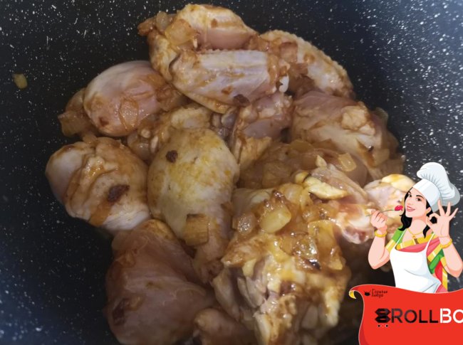 Убавляем огонь и кладем курицу. Обжариваем минут пять.