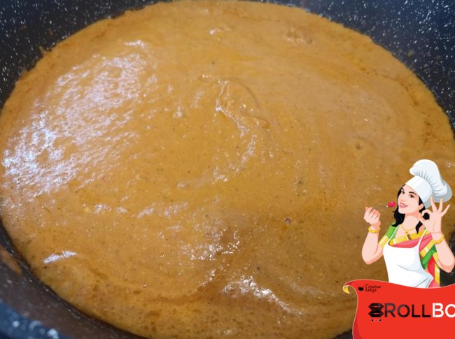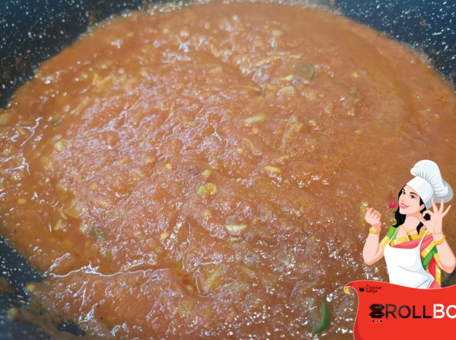 С готовой курицы надо слить выделившийся сок в сковороду с томатом. Довести до кипения, постоянно помешивая.