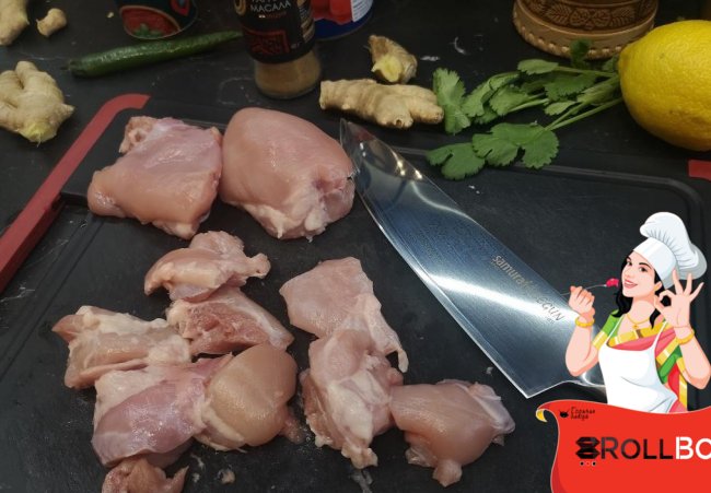 Ингредиенты На 4 порции: филе куриного бедра - 600 гр. натуральный йогурт - 200 гр. гарам масала - 2 ч.ложки молотая паприка - 1,5 ч.ложки молотая зира - 1 ч.ложка сахарный песок - 1 ч.ложка соль - 1 ч.ложка молотый черный перец - 0,5 ч.ложки чеснок - 2 зубчика имбирь - 30 гр. лимон - 40 гр. На