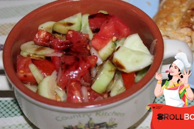 Хорошо,что я не вылила всю заливку- рулетики получились не сухие,но и не размокшие,т.е. такие,какие нужно.Очень вкусно! К рулетикам сделала обычный овощной салатик с ароматным подсолнечным маслом и сверху чуть полила бальзамиком