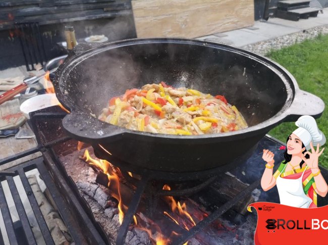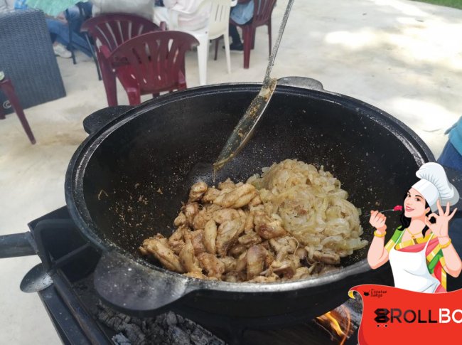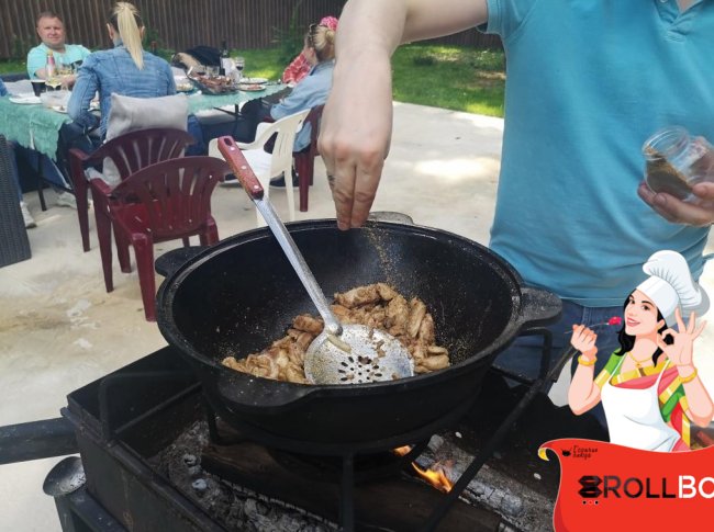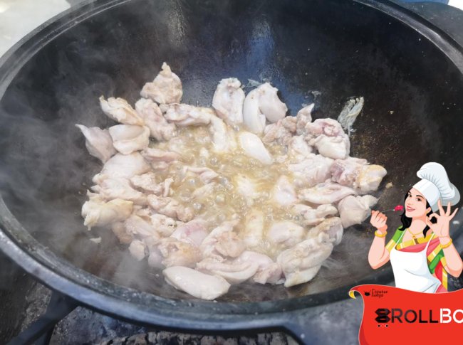 Филе куриного бедра режете на средние кусочки... Обжариваете в раскаленном казане на растительном масле. Смотрите, чтобы огонь был сильный... нам нужно, чтобы курочка поджарилась, а не варилась.