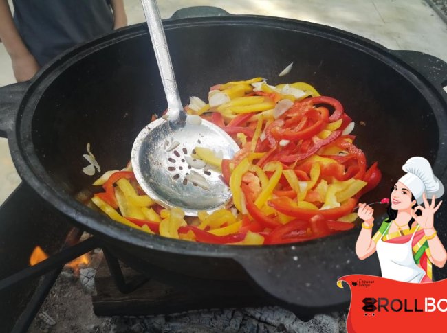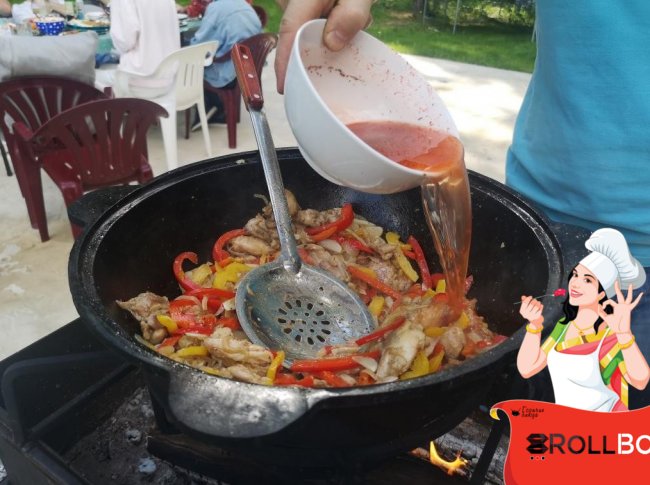 И конечно же, болгарский перчик с чесноком... Выливаем туда сок от курочки, который остался в миске.