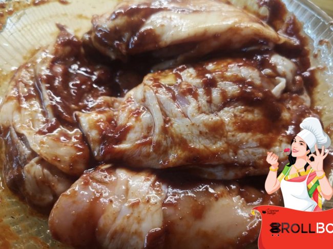 В миске смешиваем томатную пасту, грузинскую аджику, соевый соус, 1 ст.ложку оливкового масла и зубчик чеснока, нарезанный слайсами. Все перемешиваем и в этом маринаде маринуем курицу примерно 20 минут.