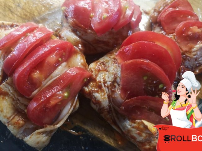 Затем разрезаем помидор пополам, нарезаем на тонкие дольки и вставляем их в прорези. Солим сверху, перчим.