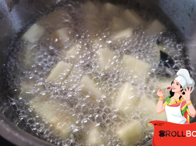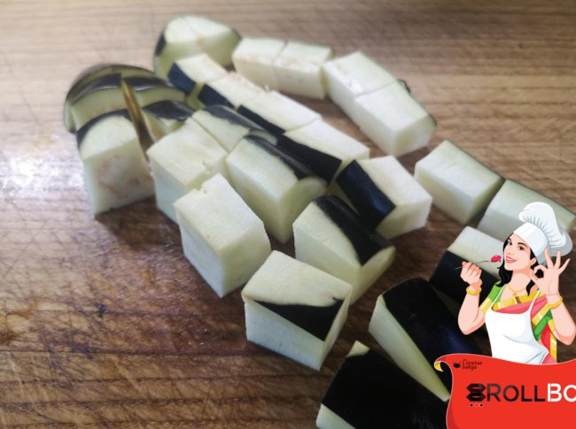 У баклажана срезаем кожицу с четырех сторон (можно почистить, но лучше не надо, а то у баклажана цвета не будет). Разрезаем баклажан вдоль, потом каждую половинку пополам и поперек на кусочки по полтора сантиметров.