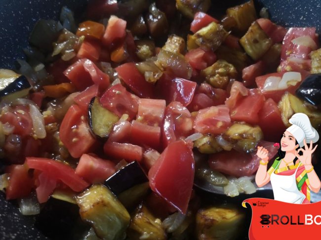 Добавляем обжаренные баклажаны, помидор, нарезанный средним кубиком... Обжариваем немного... Добавляем нарезанный мелко зубчик чеснока. Солим, перчим.