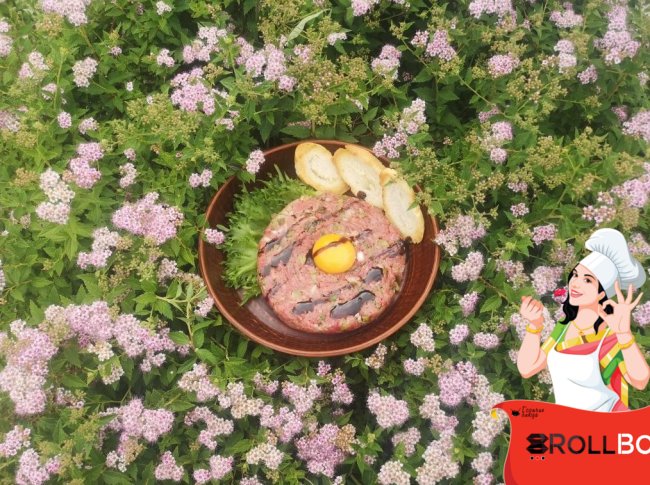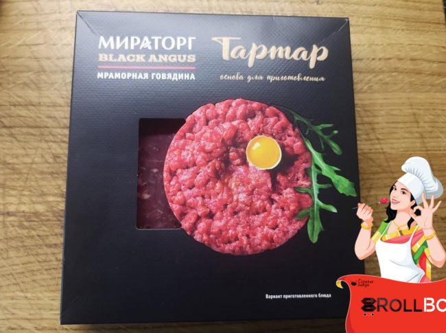 У меня была вот такая основа для приготовления тартара от Мираторг. Там мясо уже мелко нарезано, добавлена соль и перец.