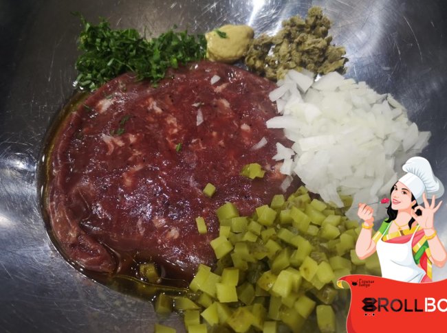 Добавляем к мясу мелко нарезанные маринованные огурчики, мелко нарезанный лук, мелко нарезанные каперсы, нарезанные листики петрушки, дижонскую горчицу, соус Ворчестер, оливковое масло.