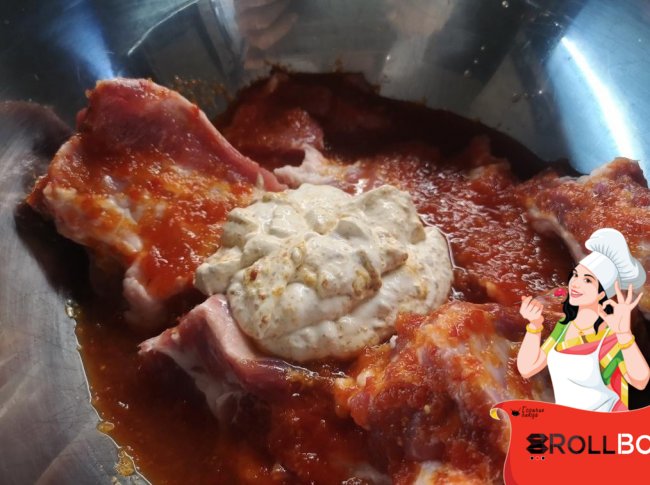Уложила их в миску. Вылила туда баночку сырой аджики. Добавила сметану, смешанную с острой аджикой с томатной пастой (она похожа на грузинскую аджику, но с более интересным вкусом).