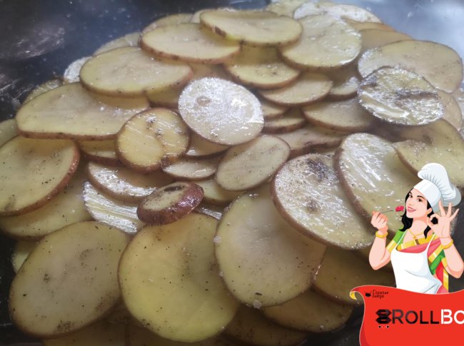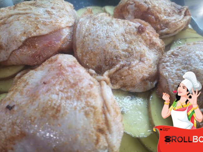 Куриные бедрышки посолила, поперчила. Посыпала молотым сухим чесноком и молотой паприкой. Уложила на картофель.