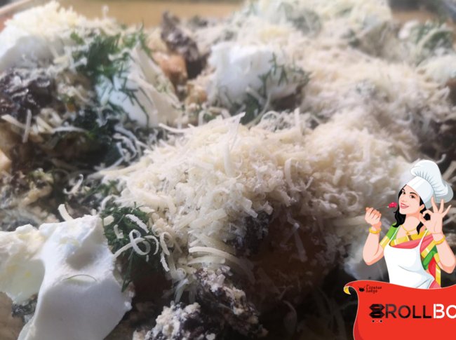 Картофель с курицей достала. Уложила сверху грибы в сливках. Сверху посыпала нарезанной зеленью укропа. А сверху - тертым сыром. У меня на данный момент был лишь творжный сыр и пармезан... А так используйте любой...