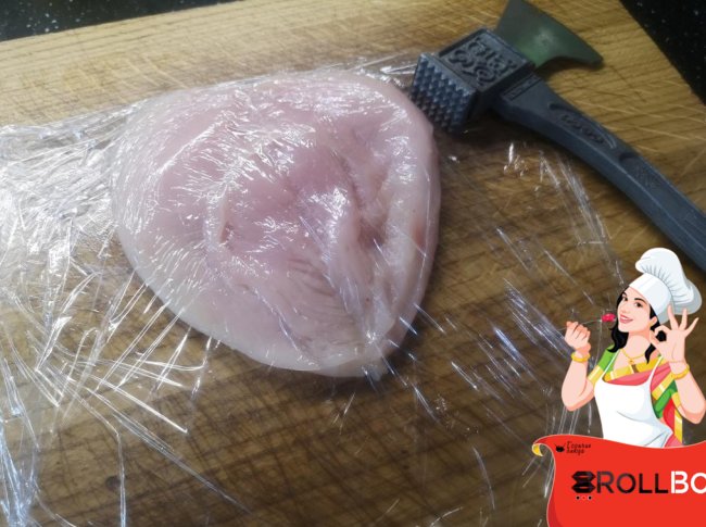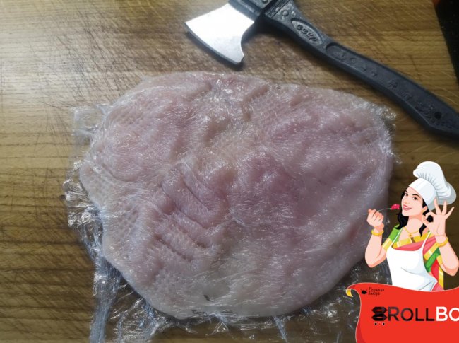 Аккуратно отбиваем, чтобы не порвать, до толщины примерно 5 мм.