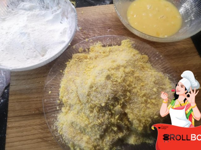 Панируем сначала в муке, потом в яйце, а потом в панировочным сухарях. Лучше всего взять сухари панко, нужны крупные сухари... у меня их не было, использовала сухари для темпуры вперемешку с обычными...