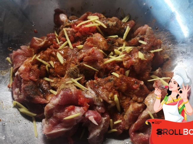 Ингредиенты свиная шея - 500-600 гр. соль, молотый черный перец по вкусу чеснок - 2 зубчика свежий перец чили - 5 гр. молотая паприка - 0,5 ч.ложки молотый кориандр - 0,5 ч.ложки соевый соус - 20 гр. яблочный уксус - 7 гр. (если нет рисового) корень имбиря - 5 гр. (очищенного) растительное масло -