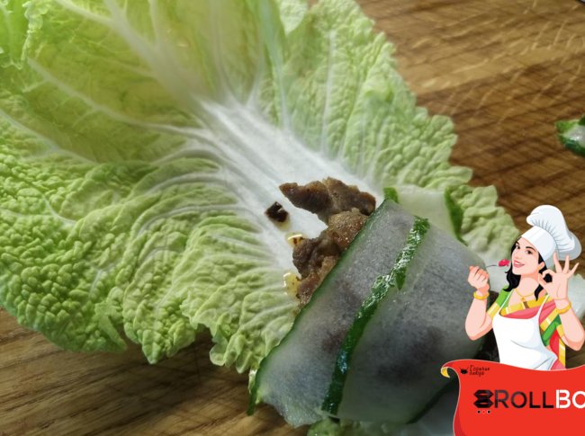 На каждый лист капусты уложила мясо, сверху 2-3 полоски свежего огурцы, который порезала на лепестки при помощи овощечистки. Свернула рулет.