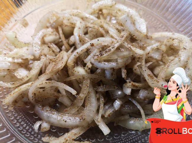 Сначала я нарезала лук полукольцами. Посолила, поперчила, добавила лимонный сок, сумах и паприку... Свежей петрушки у меня не было, положила сухую.