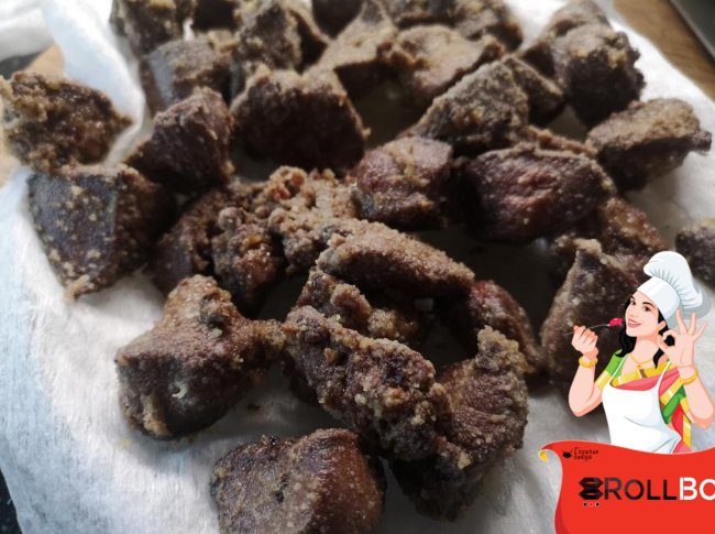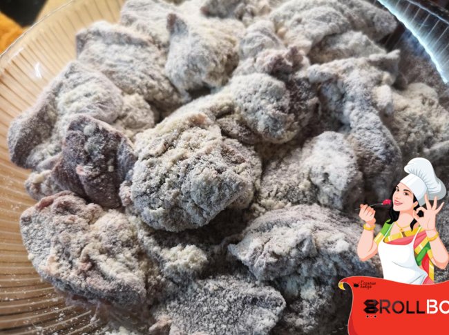 Печенку нарезала средними кусочками. Залила растительным маслом на два час. Затем откинула ее на сито... Запанировала в муке, смешанной с солью и вегетой. Лишнюю муку убрала при помощи сита.