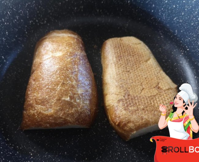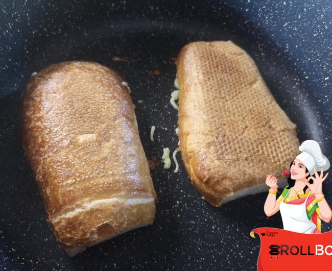 Хлеб для сэндвича разрезаем вдоль. Два куска хлеба сначала обжариваем срезом вниз, чтобы мякиш прогрелся.