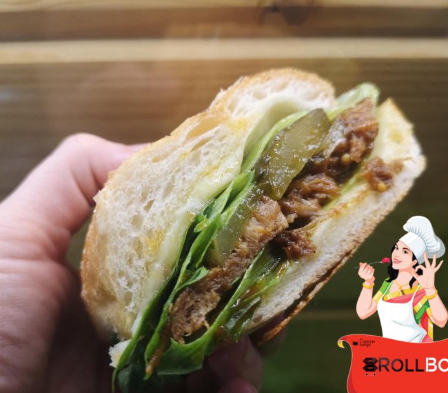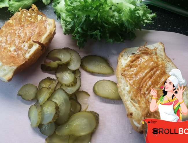 На первый сырный хлебушек кладем лист салата, затем рваную свинину, сверху нарезанный соленый огурец, можно еще салатик положить и прижимаем сверху вторым куском хлеба.