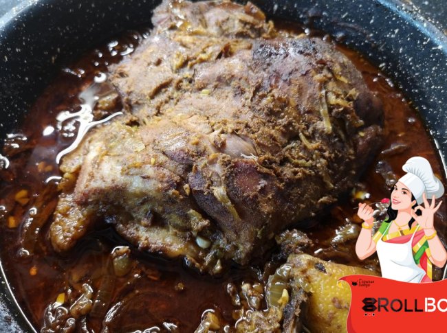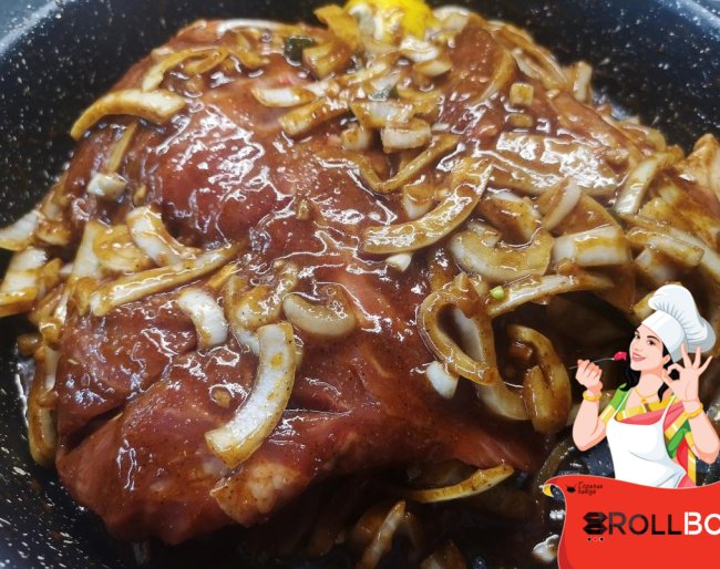 В форму для запекания надо уложить нарезанный полукольцами репчатый лук, мелко нарезанный перец чили (без семян), чеснок, сахарный песок, соль, черный перец, паприку двух сортов, вустерский соус, кетчуп, лимонный сок, растительное масло. Все перемешать. Уложить туда кусок мяса. Хорошенько смазать маринадом его со всех сторон.