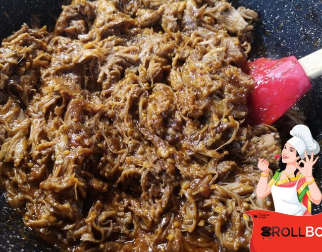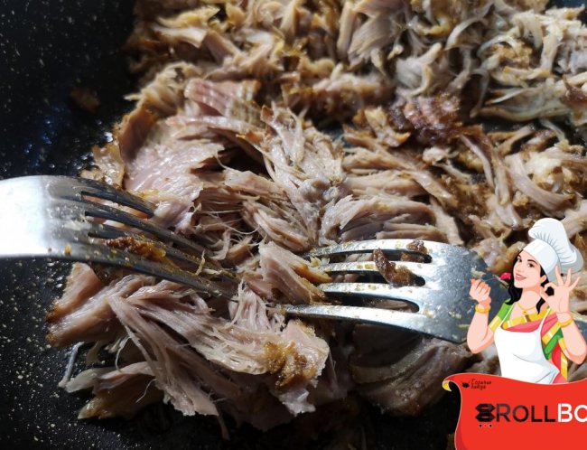 Готовое мясо достаем и сразу же при помощи двух вилок разбираем его на волокна. .