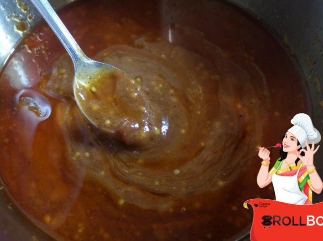 А процеженный соус переливаем в сотейник. Добавляем яблочный соус, кетчуп, томатную пасту, тростниковый сахар, остый соус, мелко нарезанный чеснок, паприку, горчицу. Доводим соус до кипения и варим минут 7, постоянно помешивая.