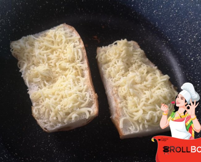 Переворачиваем. Кладем натертый на терке сыр, как бы вдавливаем его в хлебушек.