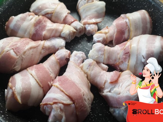 Все очень просто! Куриные голени заворачиваем в слайс бекона. У меня ушел один слайс на голень... Можно и больше навертеть, но мне кажется, это лишнее. И да, голени солить не надо!