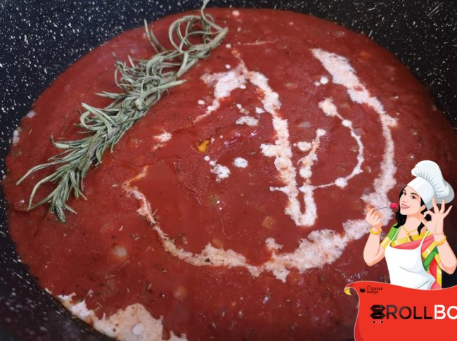 Добавила протертые томаты. Туда же специи, веточку розмарина, сахарный песок. Все перемешала. Добавила сливки. И теперь уже положила соль по вкусу. Прогрела все минуты две.