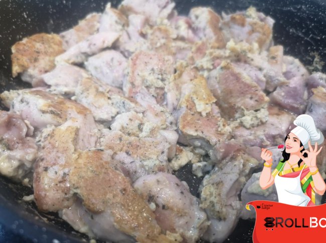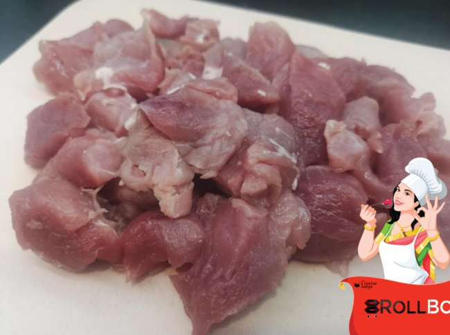 Свиную вырезку очистила от пленок и нарезала средним кубиком.