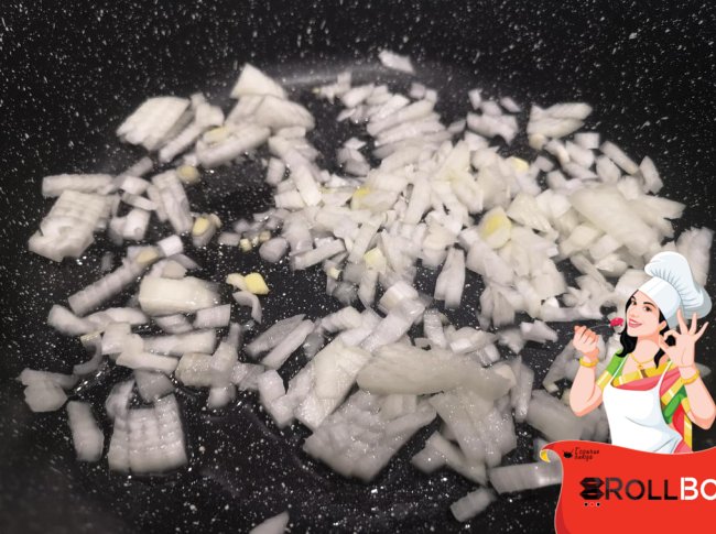 Режем мелким кубиком репчатый лук и обжариваем на растительном масле.