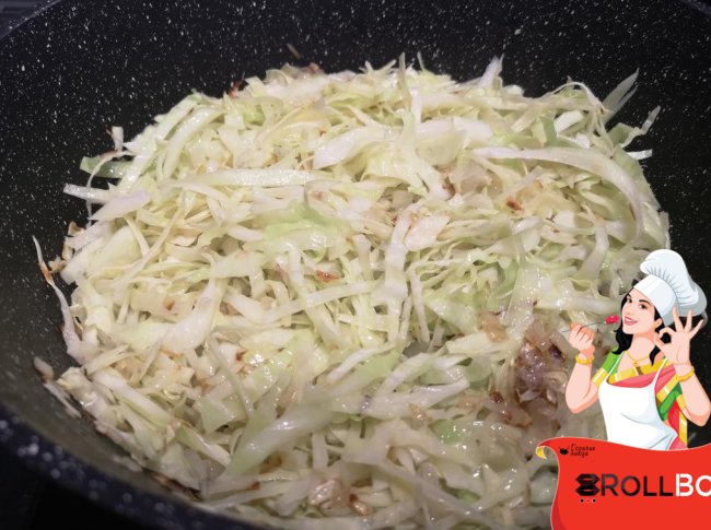 Затем добавляем к луку нашинкованную свежую капусту. Тушим все минут 5.