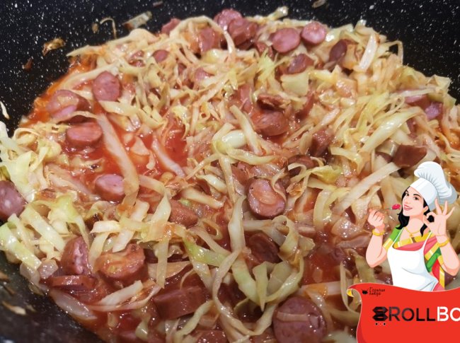 Охотничьи колбаски нарезаем кругляшками и добавляем к капусте, когда она потушится. Солим, добавляем немного сахарного песка.