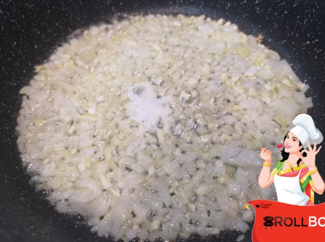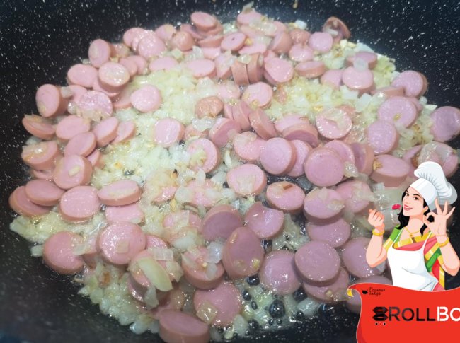 Пяток сосисок нарезать (во многих рецептах обычные - венские) и обжарить в сливочном масле с луком (взяла 1 шт.) и чесноком (взяла 3 зубчика).