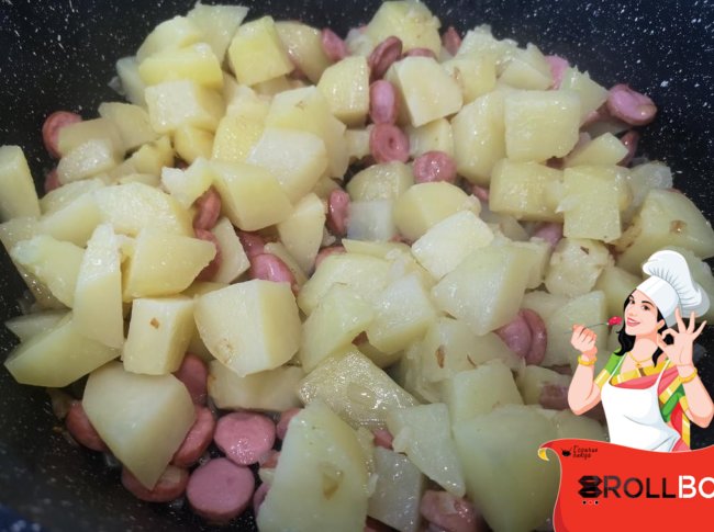 Нарезанный кубиком и подваренный минут 5-7 в воде картофель подбросить туда же в сковороду к сосискам (9 шт.картофеля отварила в мультиварке на пару до готовности... побоялась, что он задубеет, т.к. потом добавляется томат).