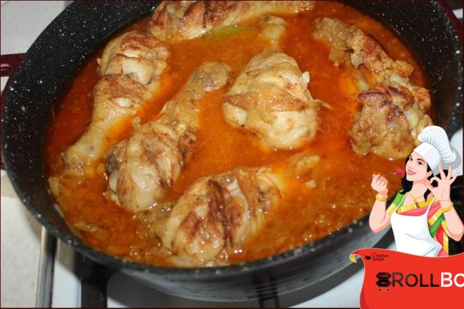 Сода как бы растворяет лук и постепенно он превращается в жидкий соус. Как только соус начинает становиться жидким ,мы ставим на огонь еще одну сковородку, наливаем немного масла, хорошенько разогреваем на сильном огне и обжариваем голени с двух сторон до румяной корочки.( в принципе голени можно и не обжаривать ,а выложить в соус сырые ,но так мне кажется вкуснее) В луковый соус добавляем соль по вкусу,1-2 столовые ложечки соуса сладкий чили(по желанию),перемешиваем и выкладываем в соус обжаренные голени. Еще немного убавляем огонь и тушим на маленьком огне примерно минут 20,затем голени переворачиваем и тушим еще минут 20 до готовности .Минут за 10 до окончания тушения добавляем пару лавровых листиков и чеснок ,пропущенный через пресс или натертый на терке .Пробуем на соль, если необходимо, подсаливаем.