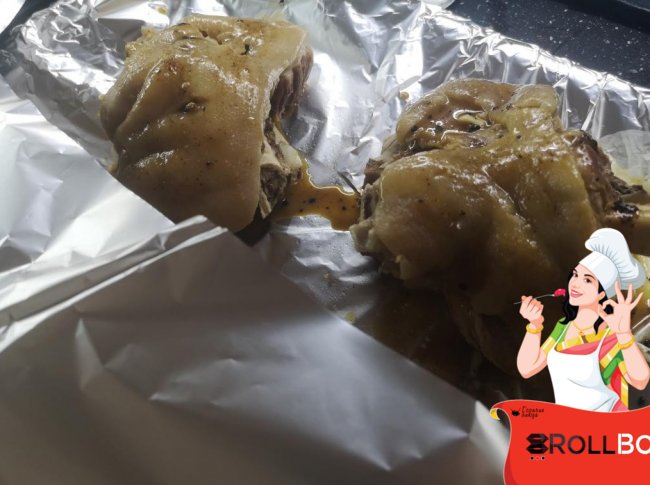 Этой смесью щедро обмазать рульку со всех сторон. Завернуть рульку в фольгу и запекать в духовке 1 час при 200?C. В последние 10 минут фольгу развернуть, чтобы образовалась красивая корочка.