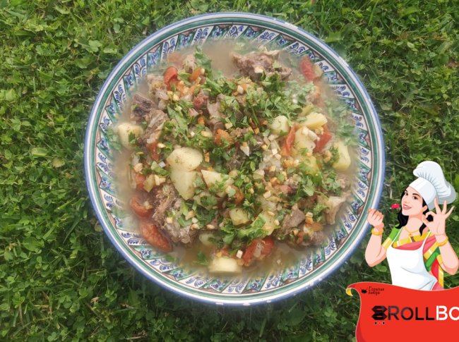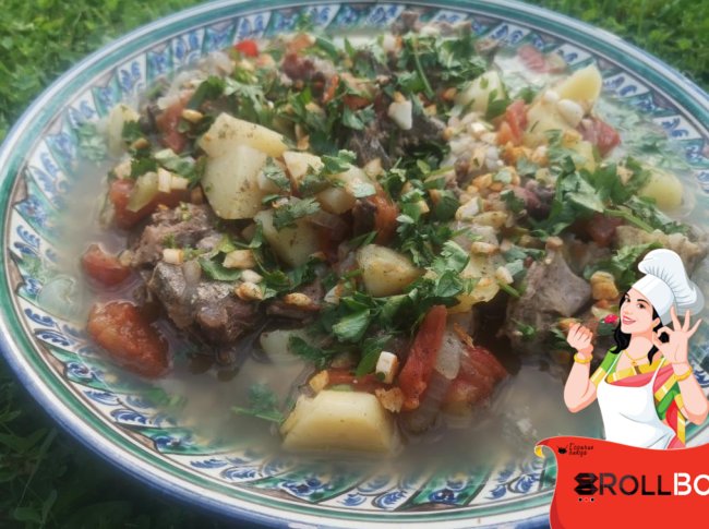 Ингредиенты баранина ~ 1 кг (у меня шея) репчатый лук - 3 шт. (среднего размера) помидоры - 4 ш. болгарский перец - 1 шт. картофель - 1 шт. соль, молотый черный перец по вкусу хмели-сунели зелень петрушки и зелень кинзы чеснок - 1 головка молотая сладкая паприка кипяток Приготовление Сначала режем