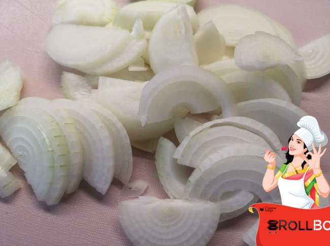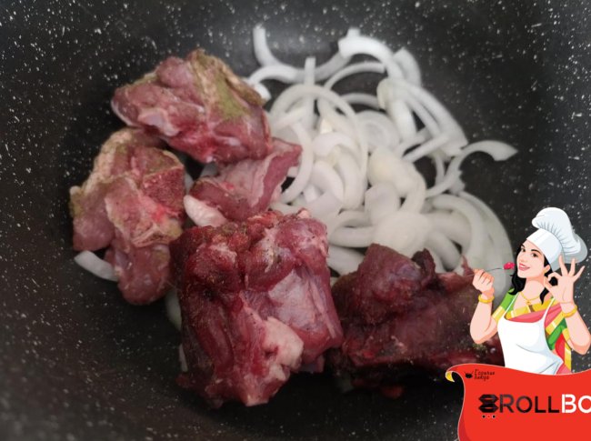 Теперь укладываем в емкость, в которой будем запекать хашламу, сначала 1/2 репчатого лука... на него укладываем баранину.