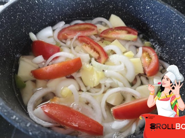 Затем опять слой лука. перца, помидор. Заливаем кипятком из чайника, чтобы скрыло немного верхний слой.